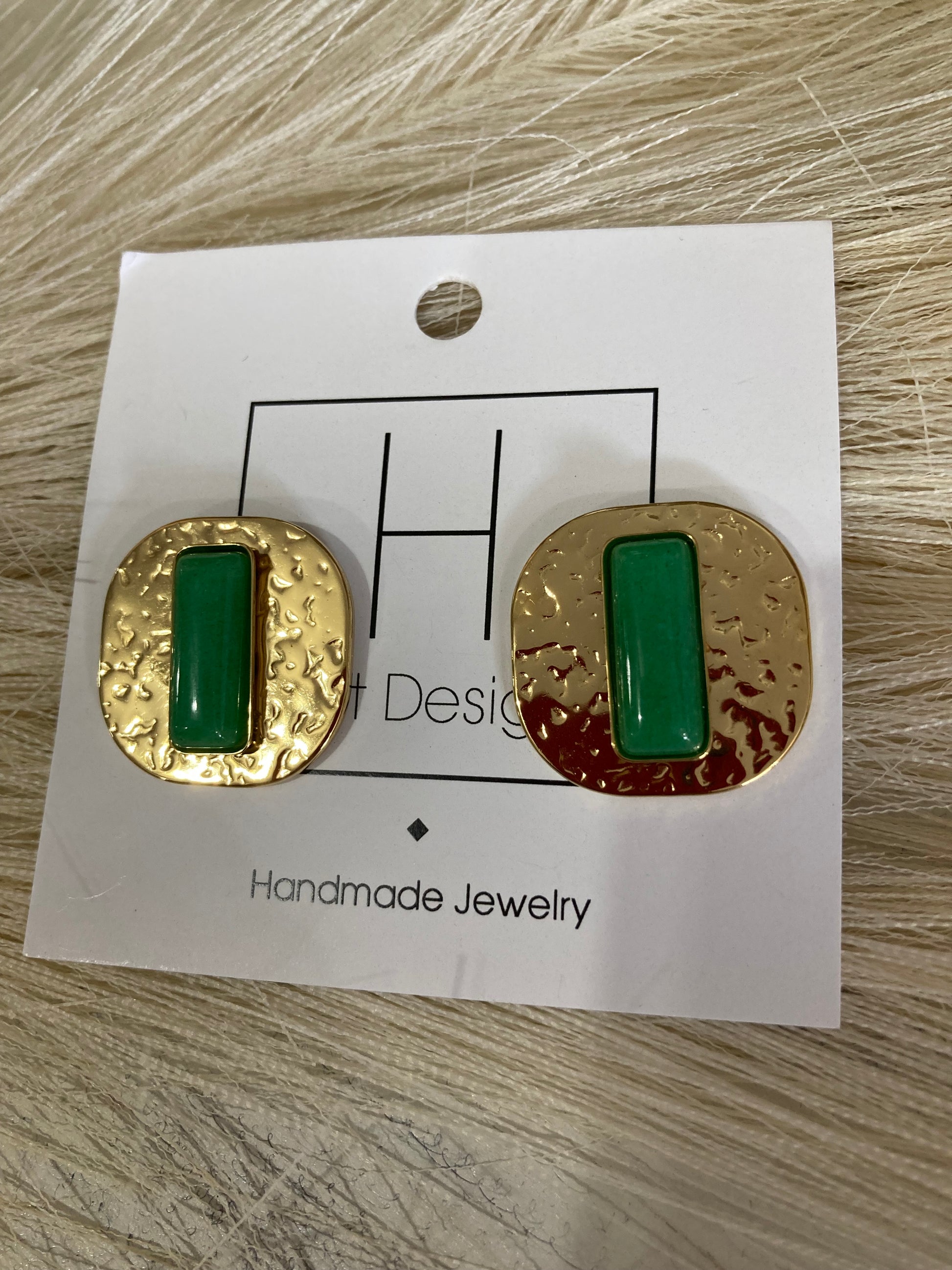 Gold Hammered Green Rectangle Studs